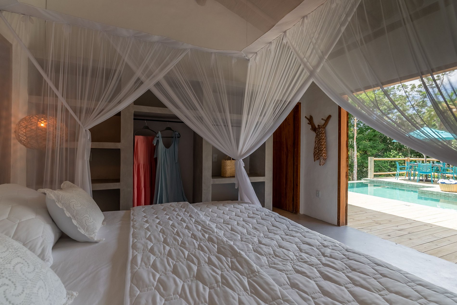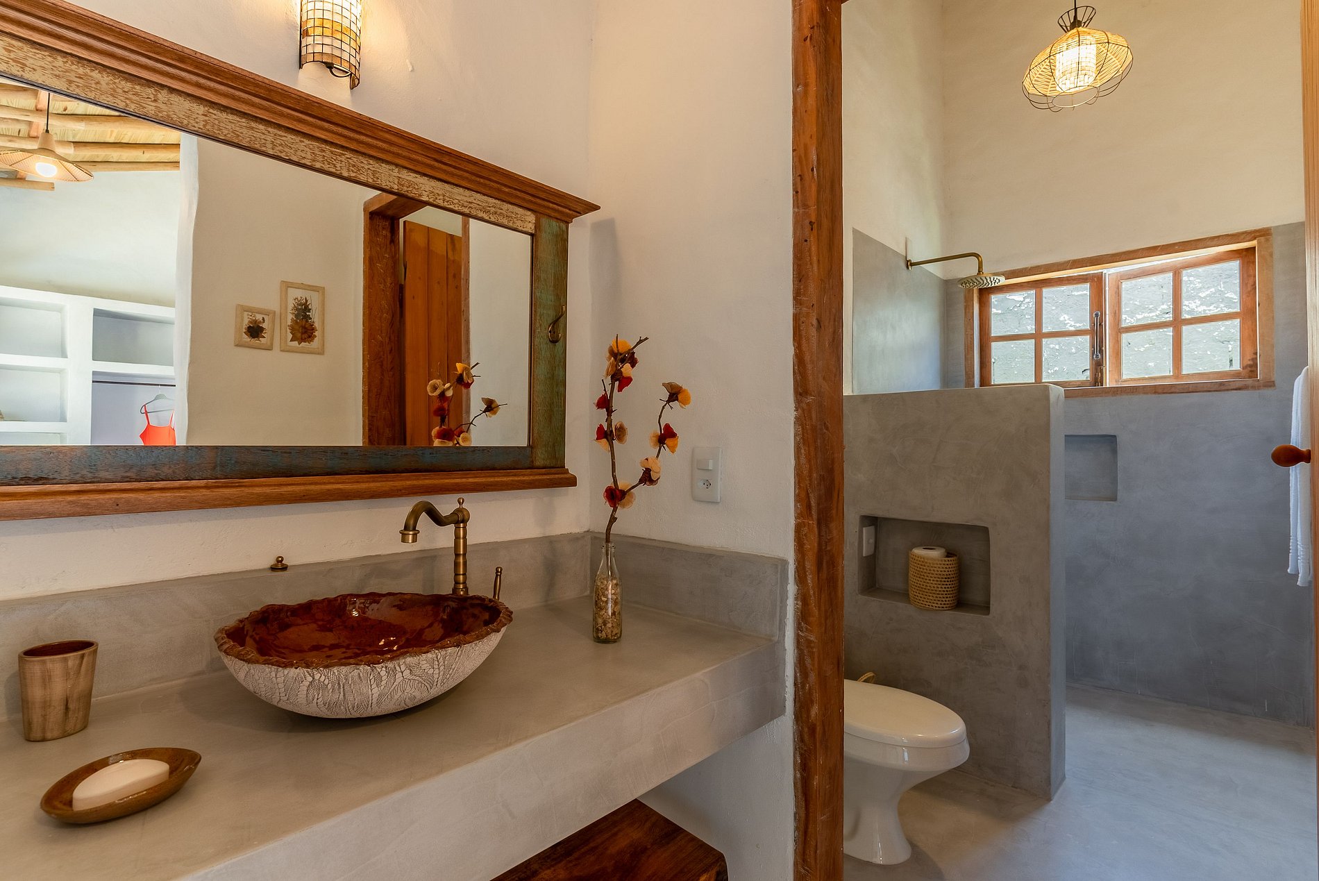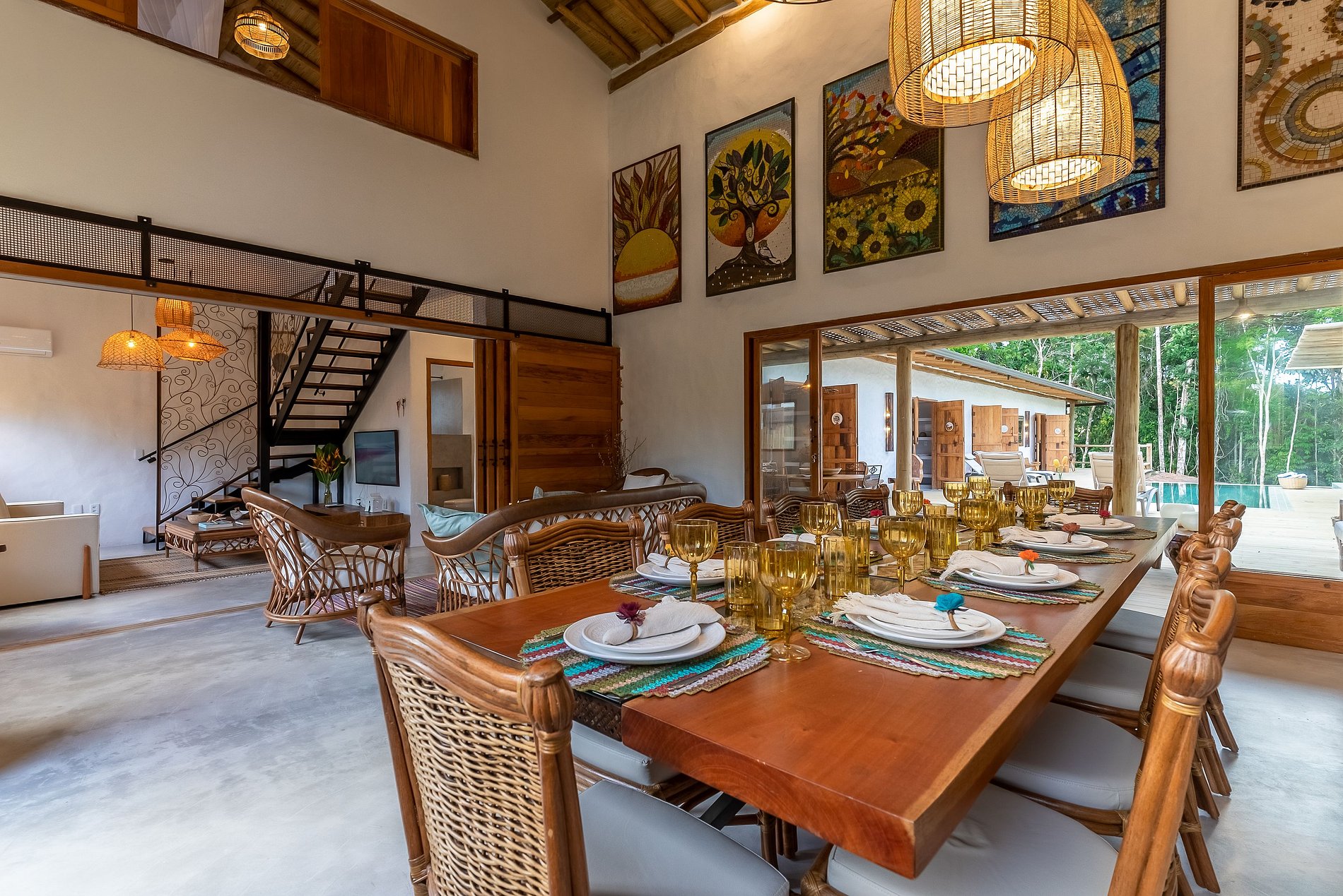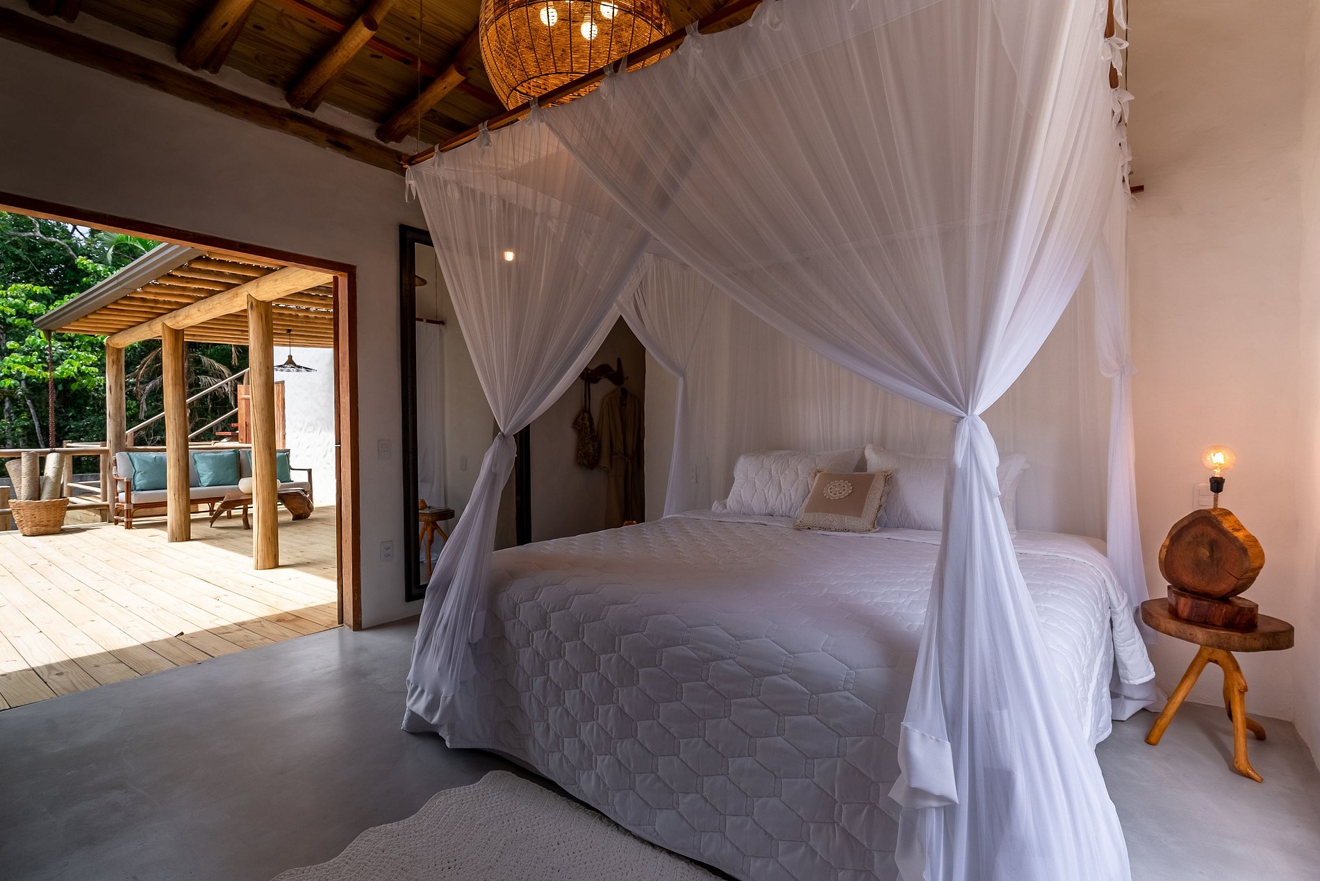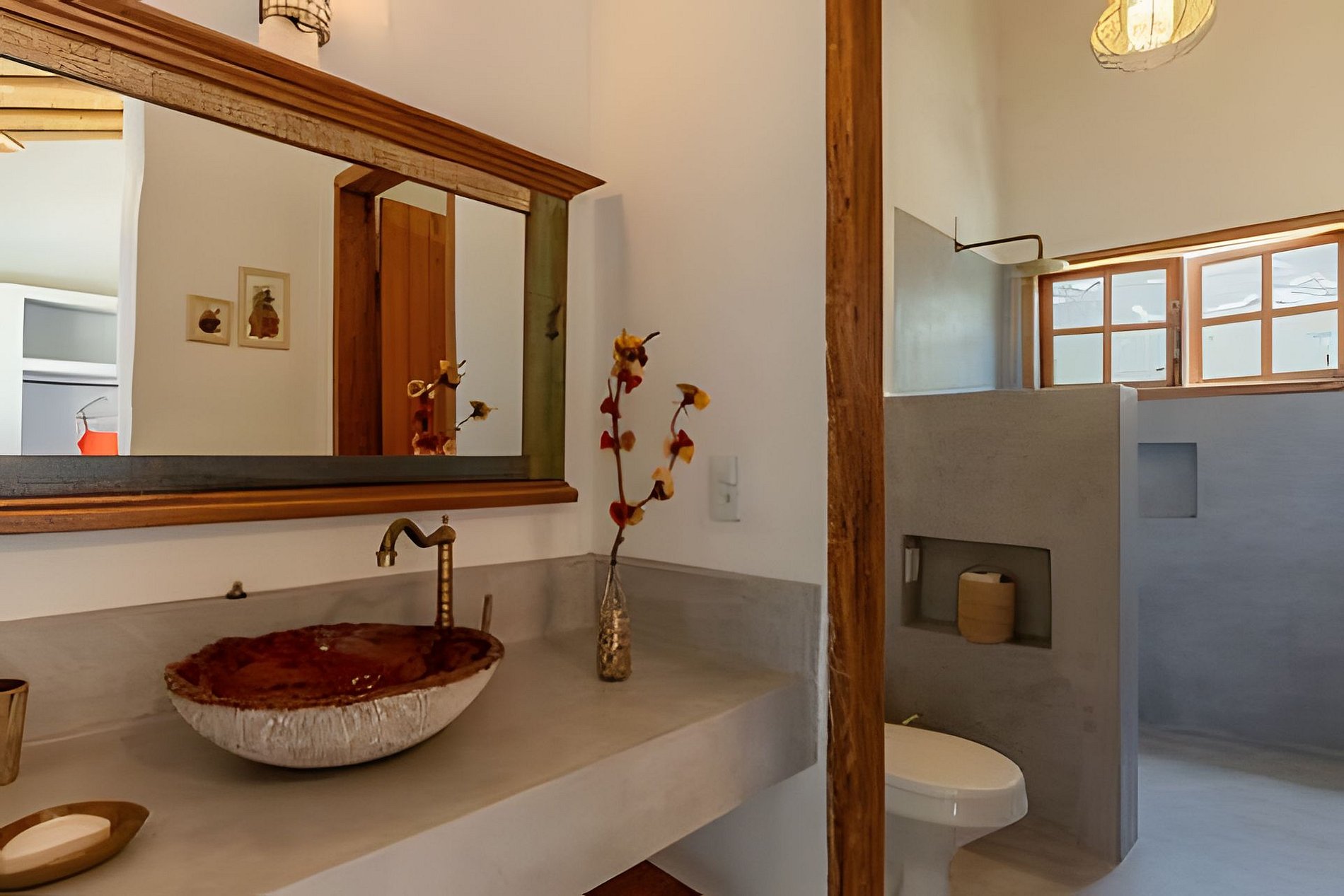 Estilo rústico sofisticado (reboco Santa Fé) e decoração autoral que valoriza o artesanato brasileiro de vários estados. Perfeita para aluguel de temporada em Trancoso, com conforto de hotel e privacidade de casa.