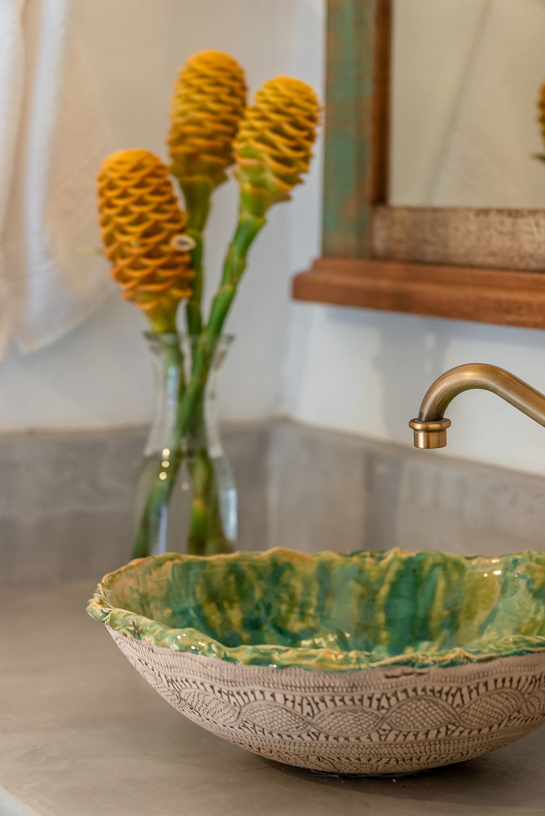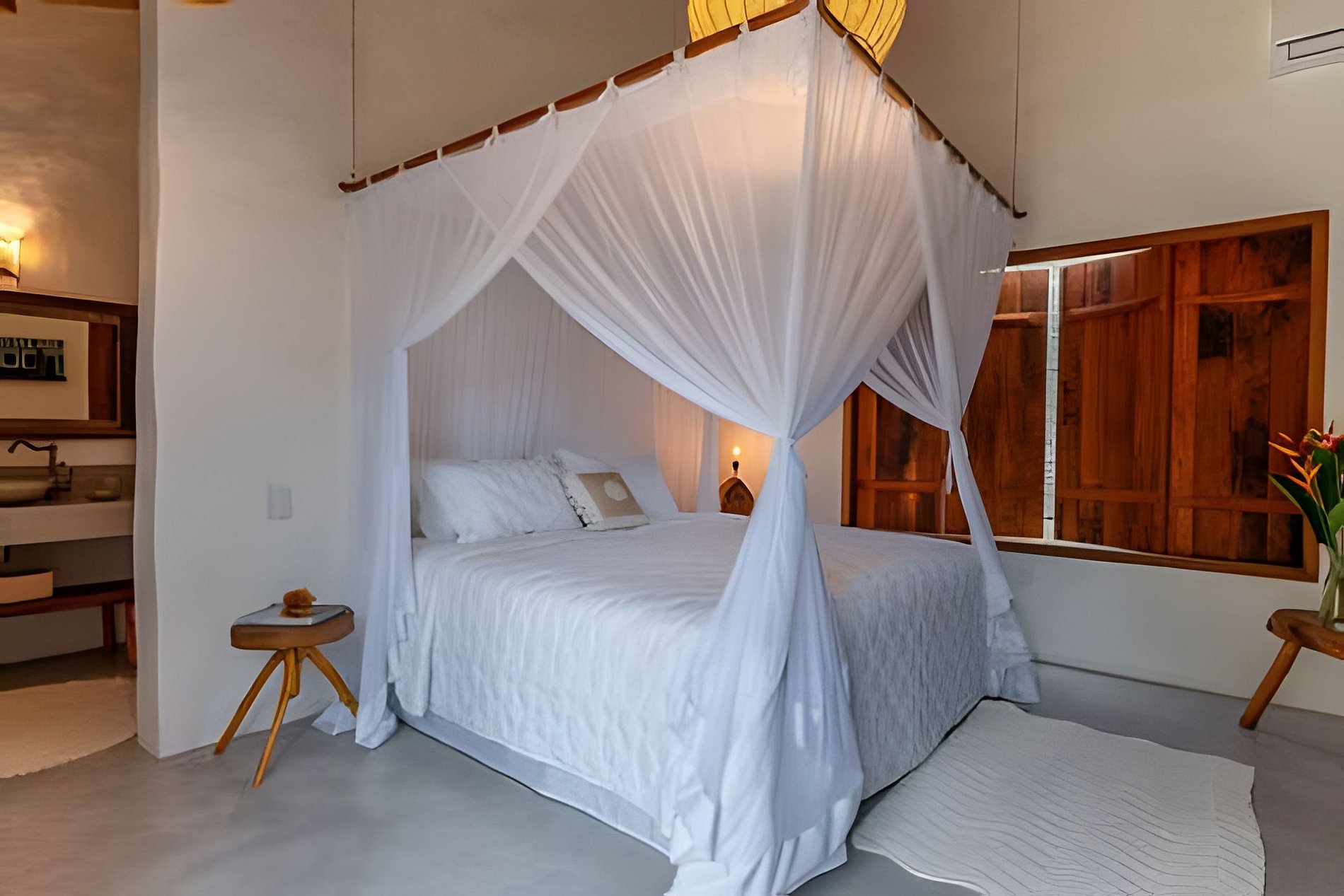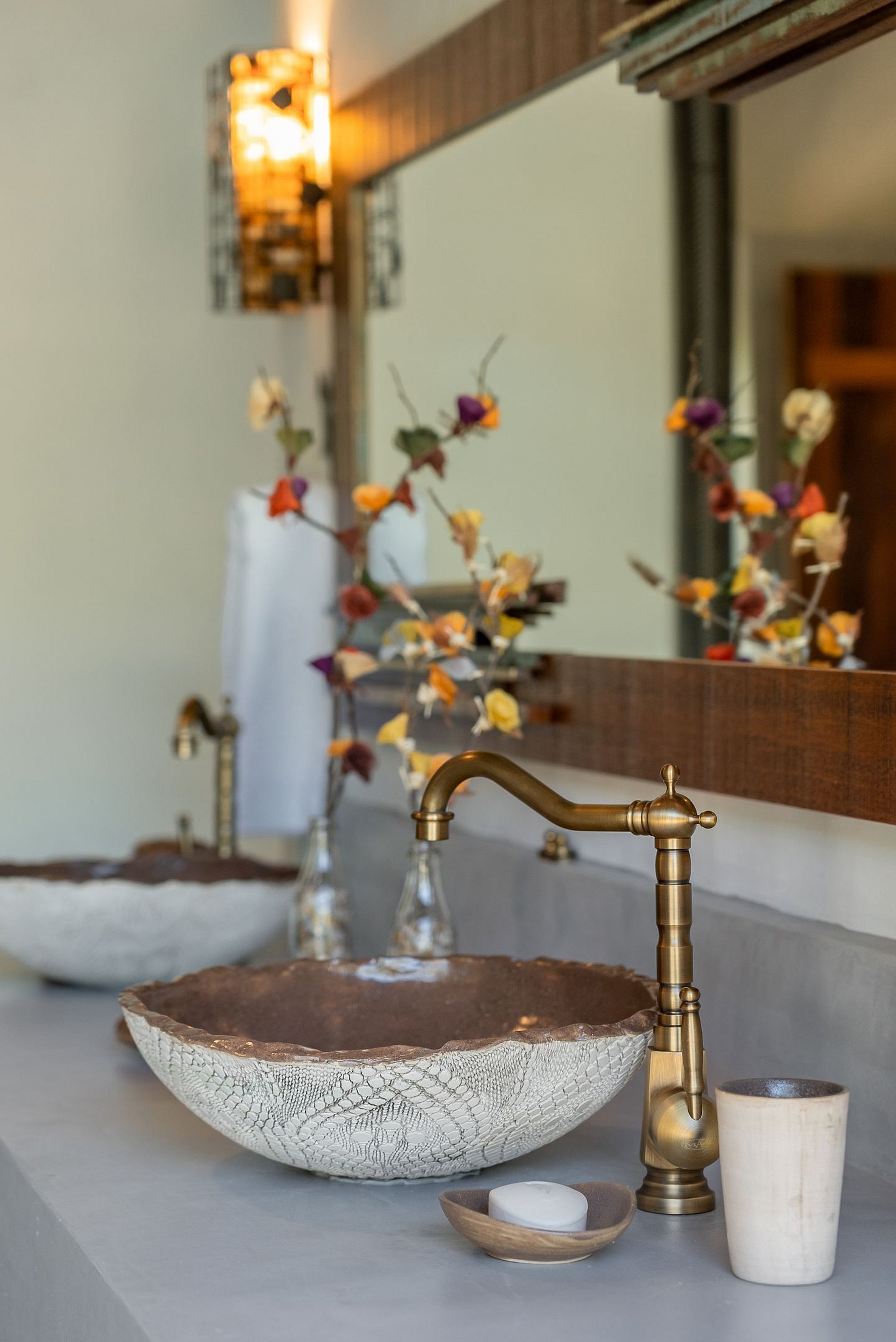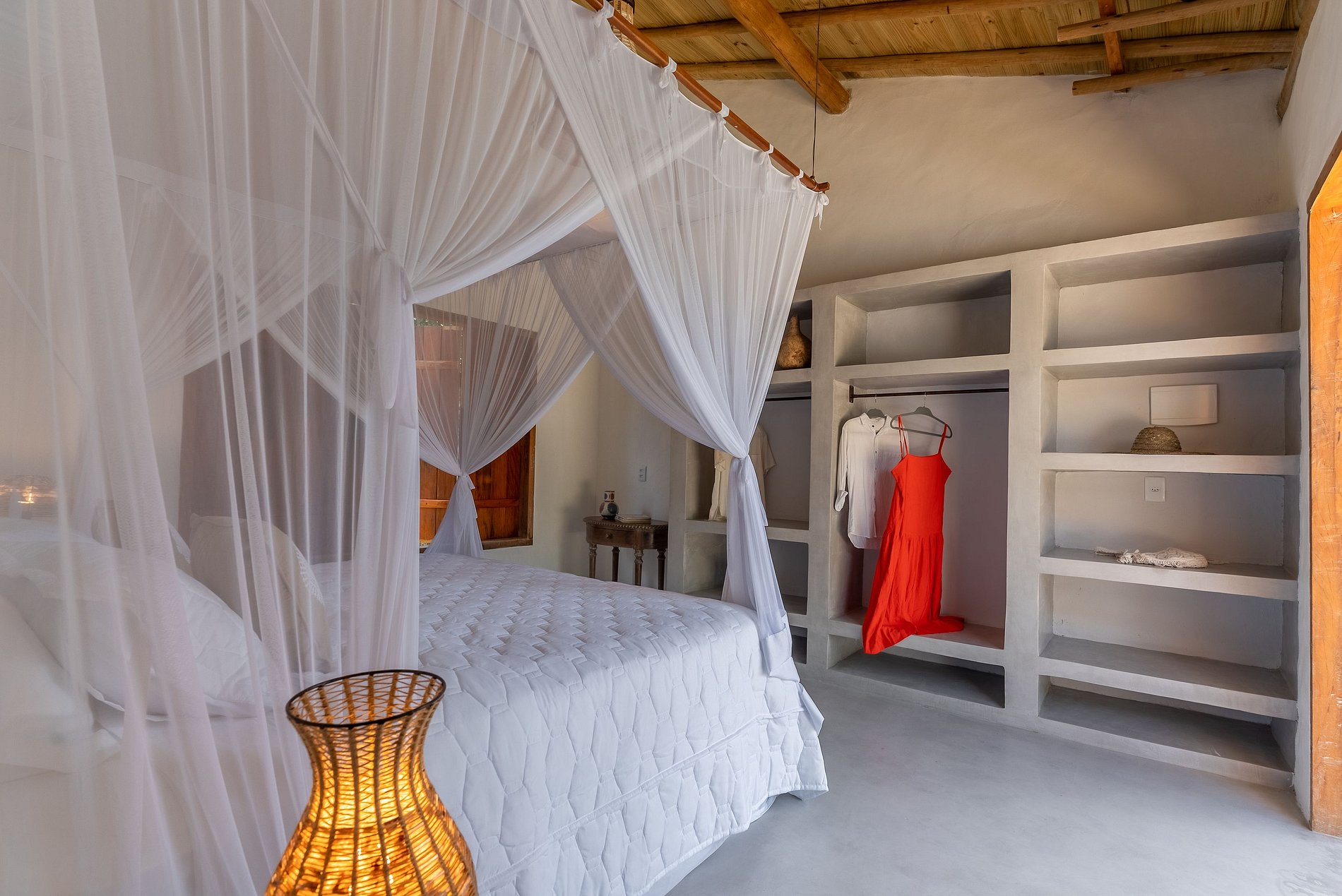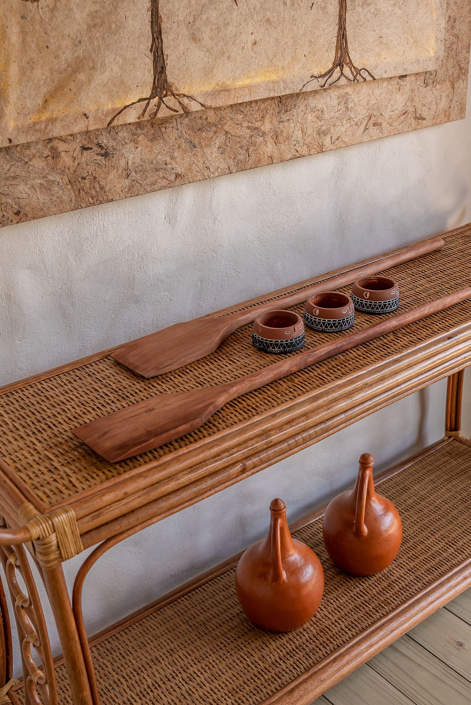 Estilo rústico sofisticado (reboco Santa Fé) e decoração autoral que valoriza o artesanato brasileiro de vários estados. Perfeita para aluguel de temporada em Trancoso, com conforto de hotel e privacidade de casa.
