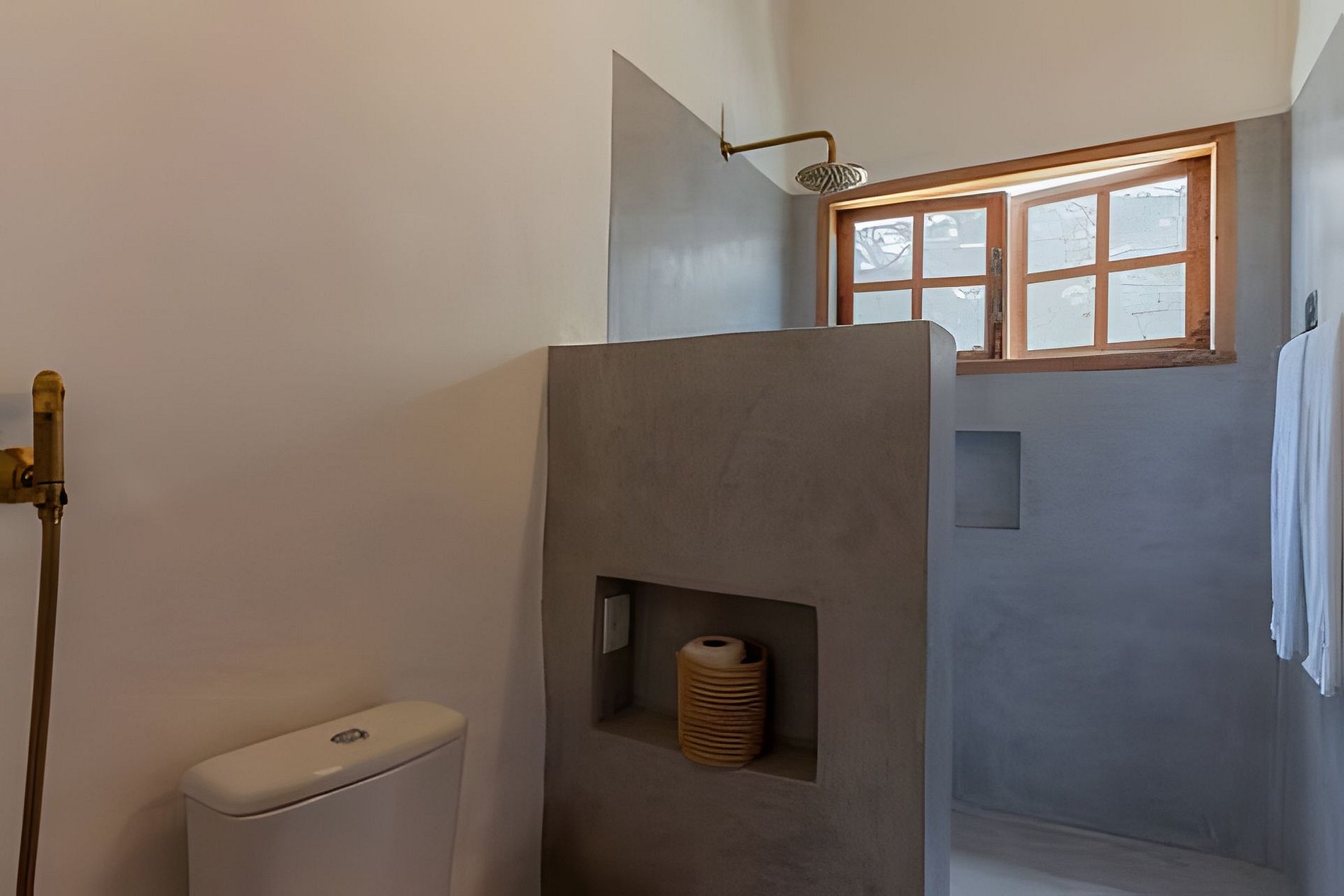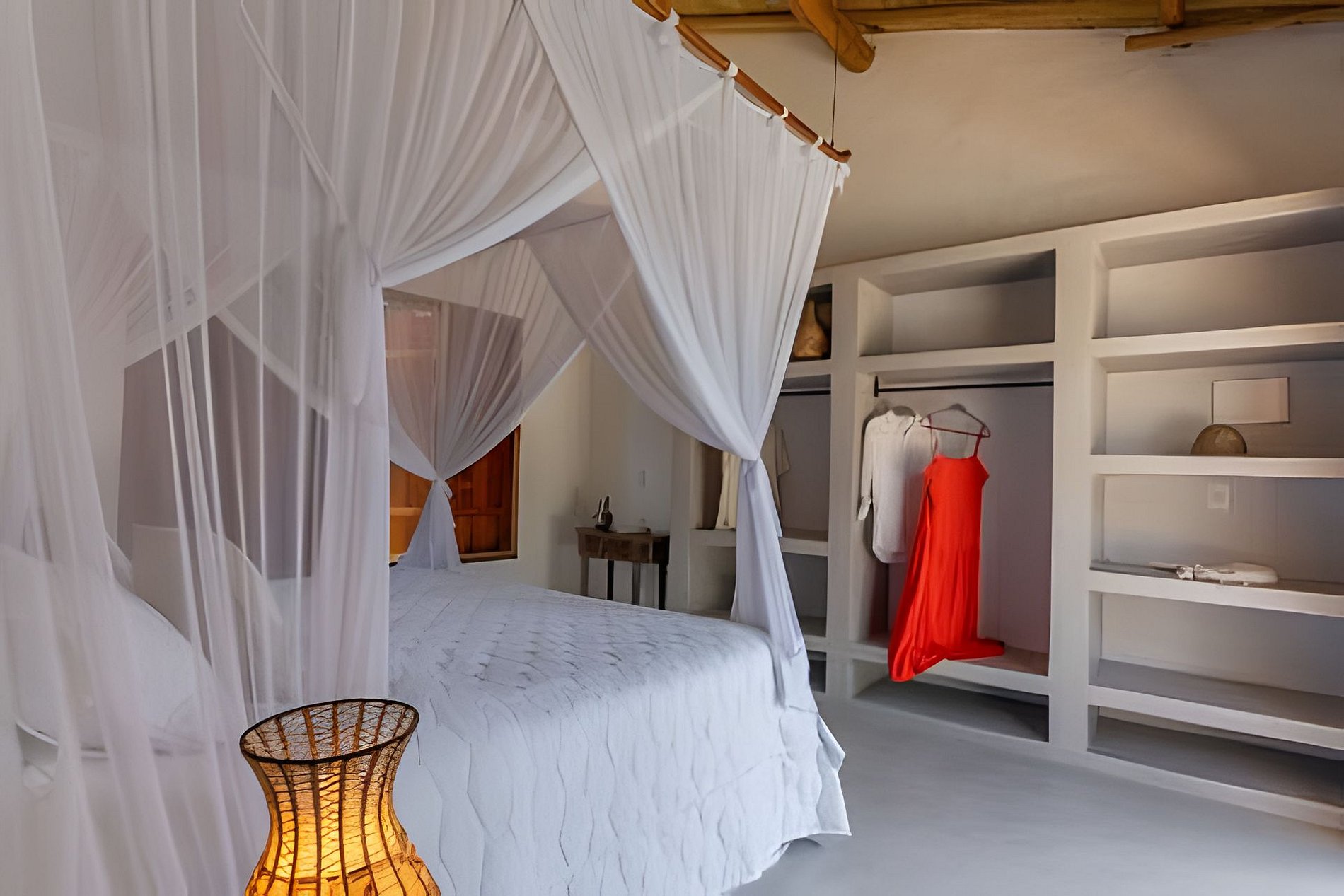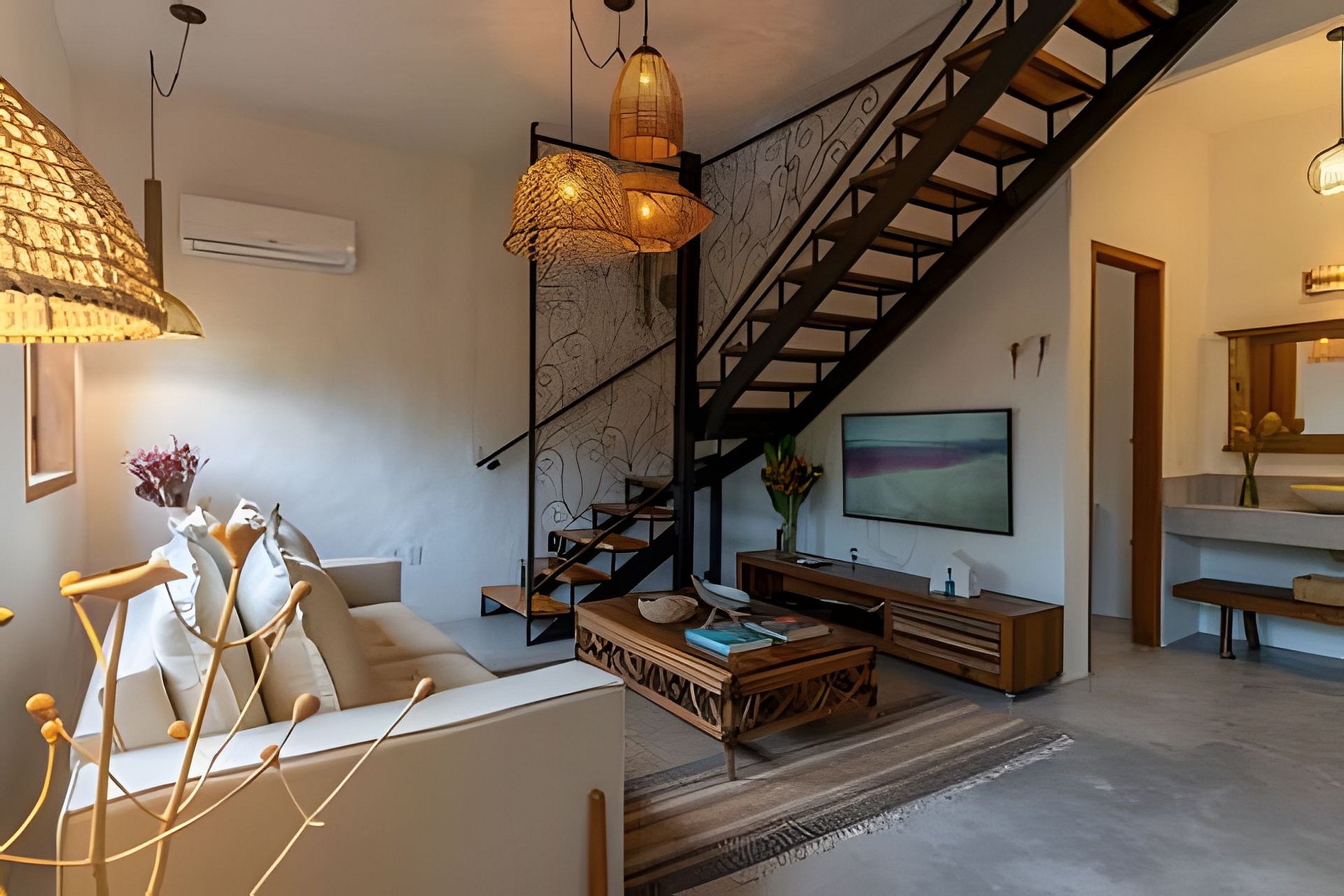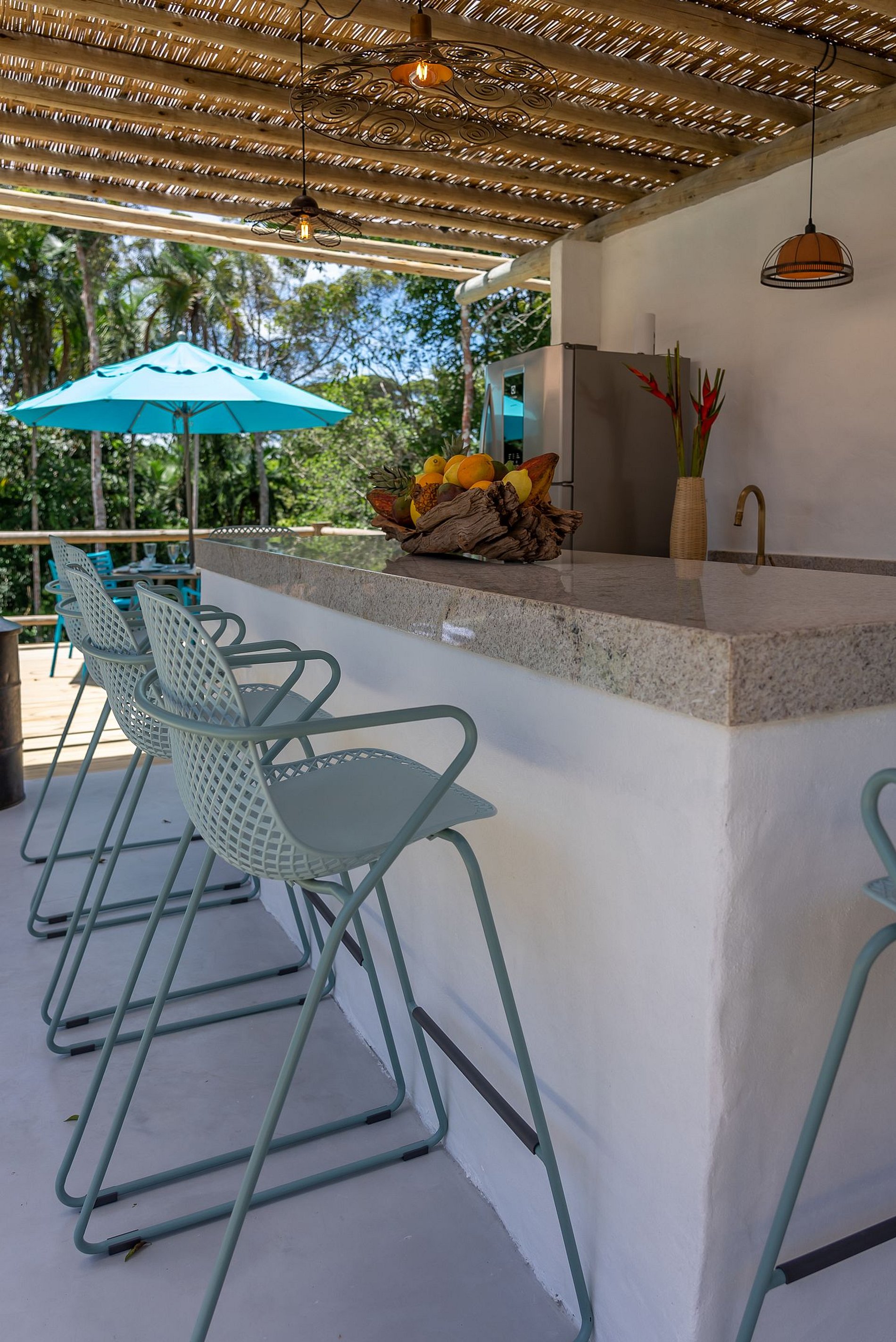Estilo rústico sofisticado (reboco Santa Fé) e decoração autoral que valoriza o artesanato brasileiro de vários estados. Perfeita para aluguel de temporada em Trancoso, com conforto de hotel e privacidade de casa.