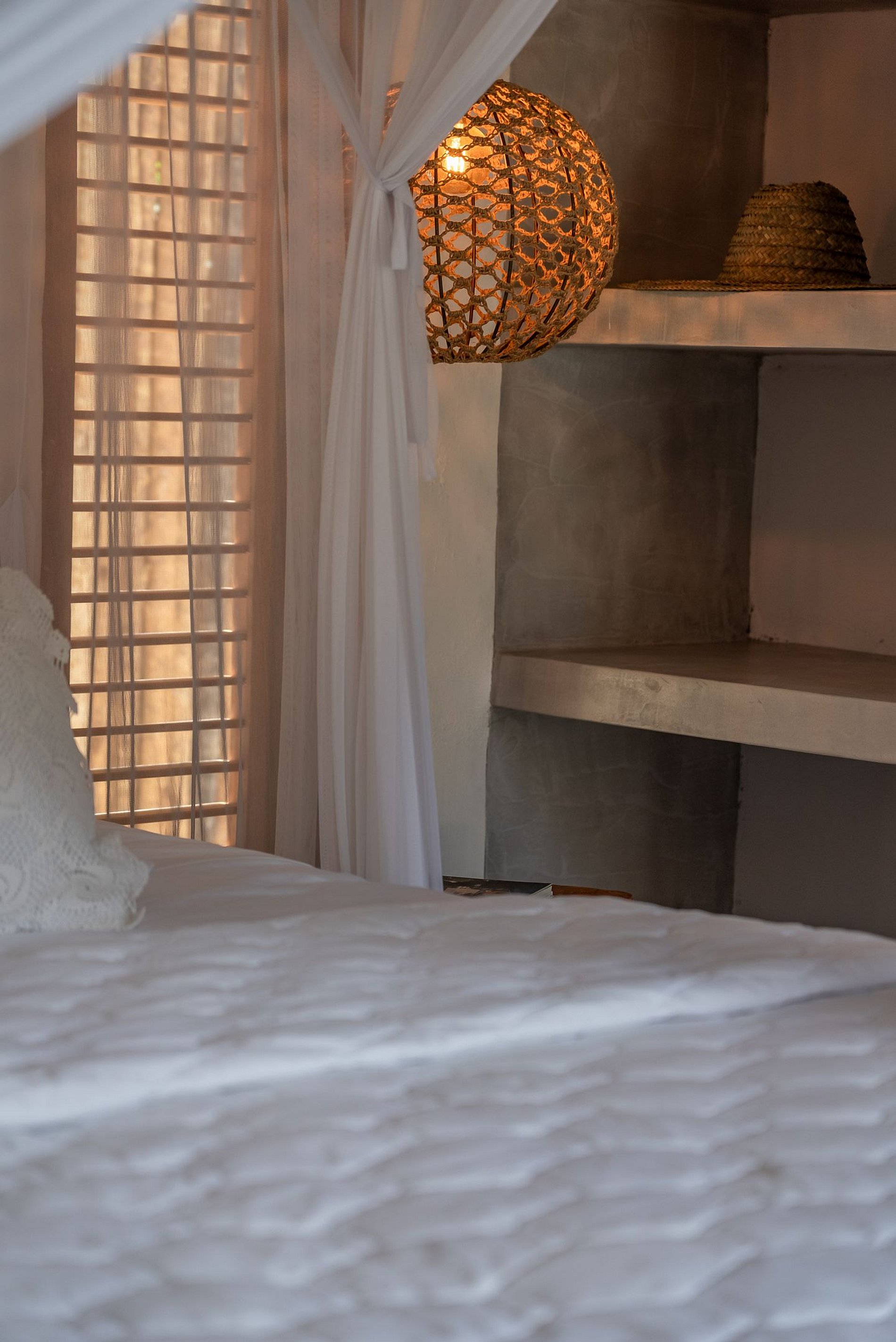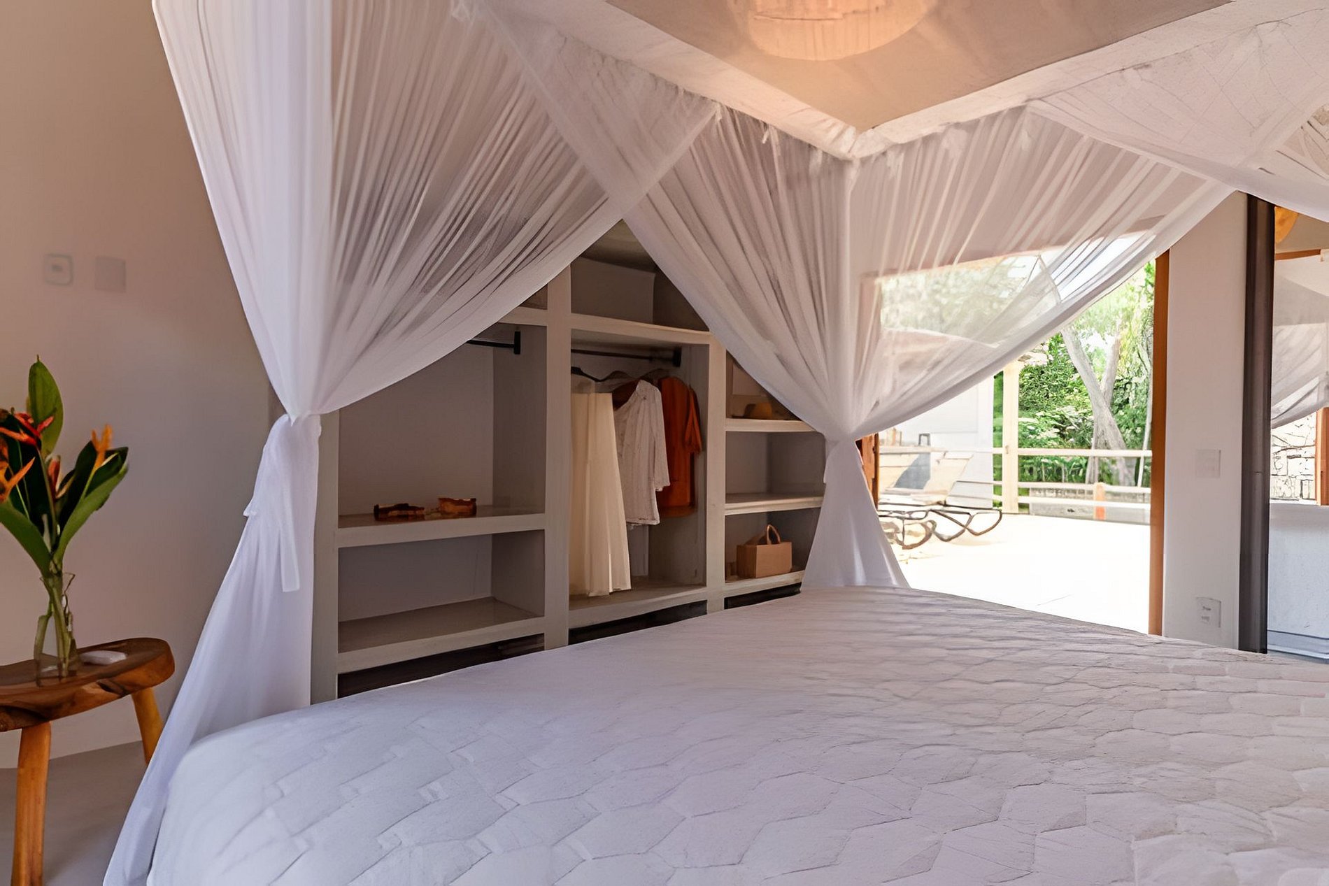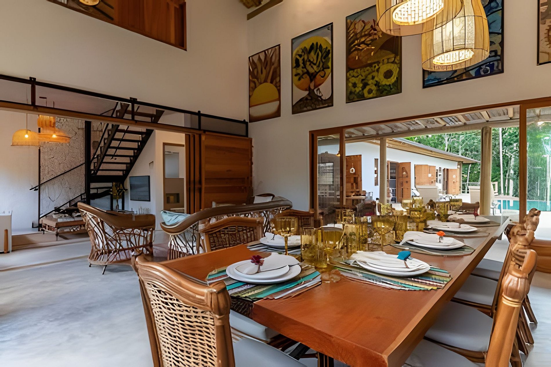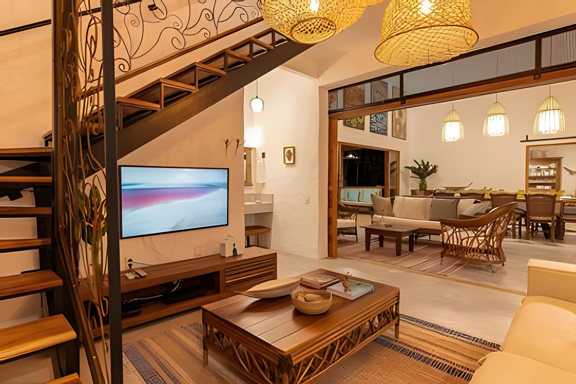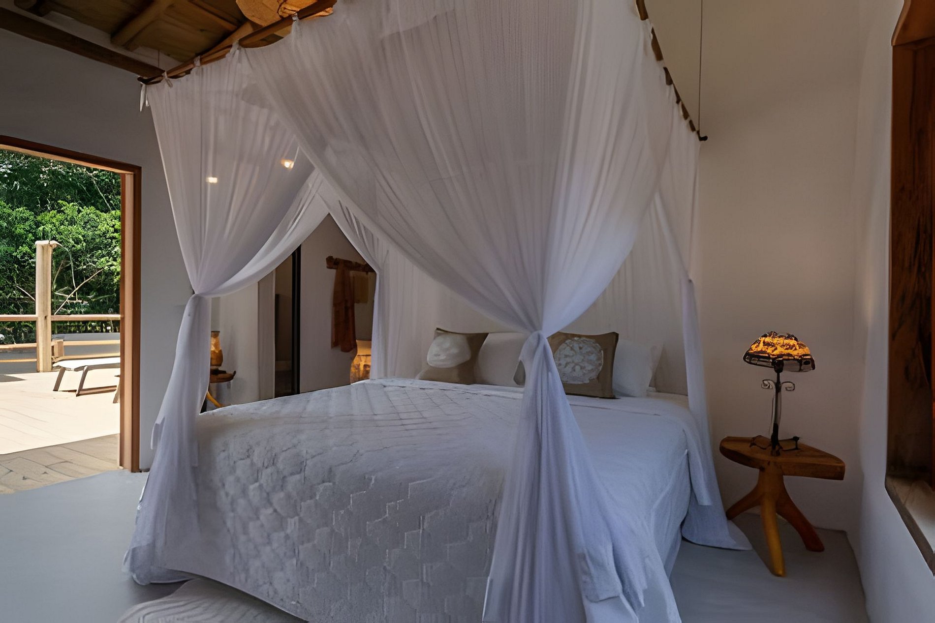 Estilo rústico sofisticado (reboco Santa Fé) e decoração autoral que valoriza o artesanato brasileiro de vários estados. Perfeita para aluguel de temporada em Trancoso, com conforto de hotel e privacidade de casa.