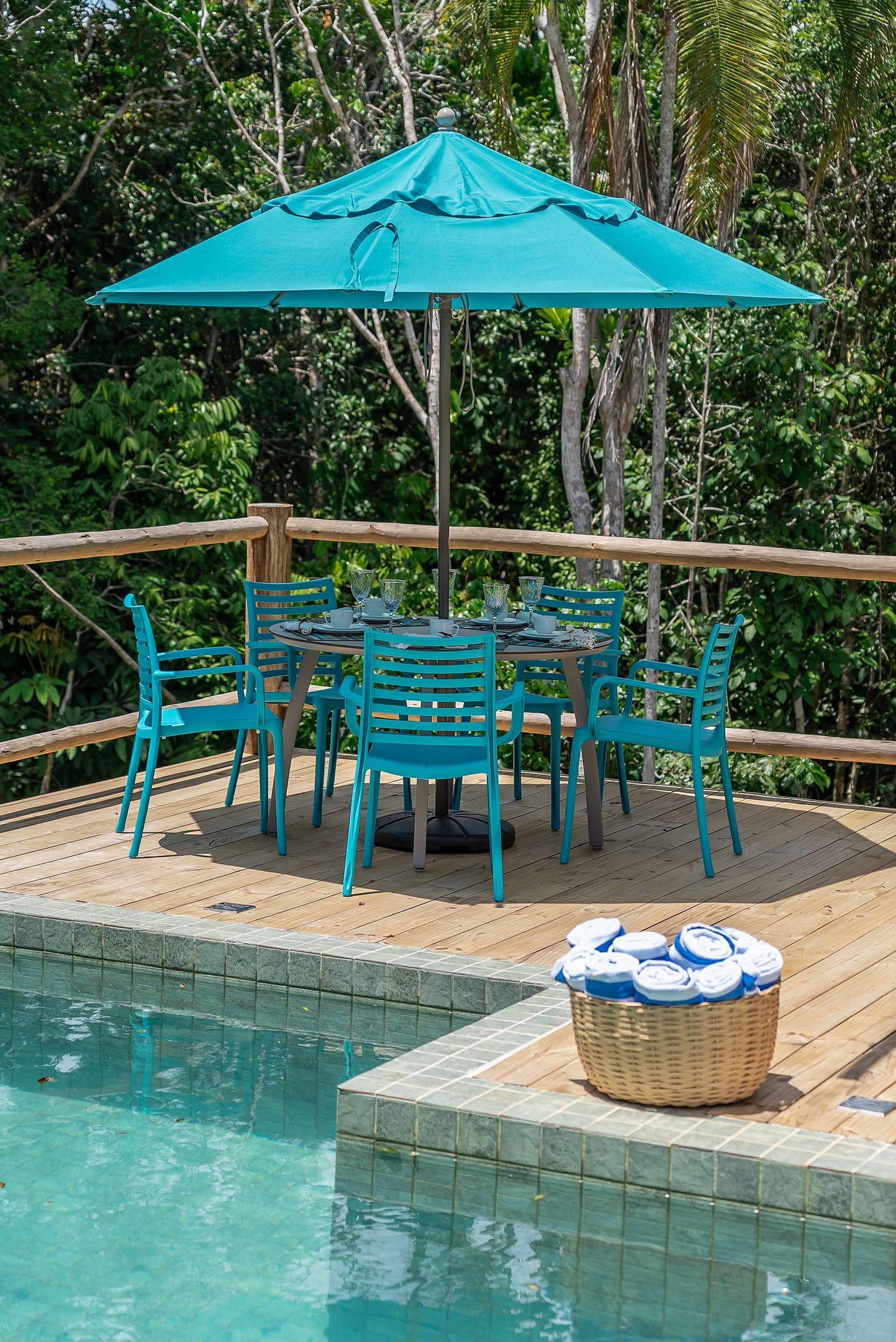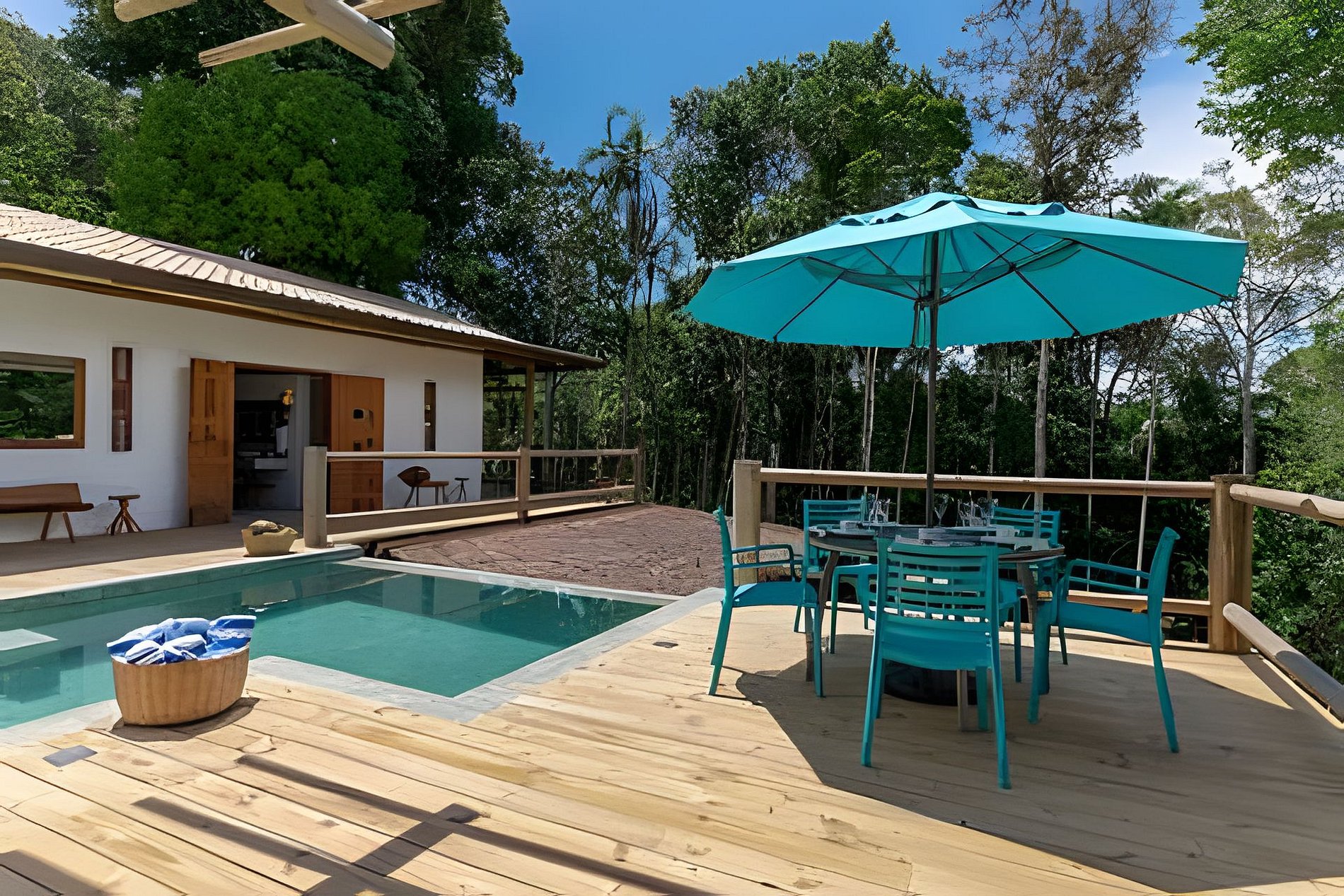 * Piscina com borda infinita + hidromassagem, ducha externa e vista panorâmica para a mata.